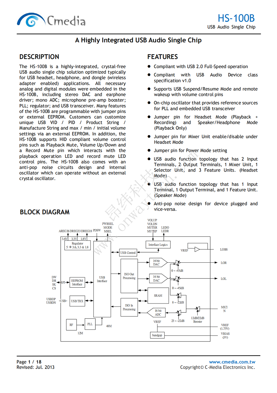 在驊訊系列IC中,最被大家熟知的非它莫屬:HS-100B,它的前身是HS-100,這顆芯片于2009年推入市場(chǎng),市場(chǎng)反響很好。后來驊訊對(duì)其進(jìn)行了整體的升級(jí)優(yōu)化,并以HS-100B命名,這顆傳奇級(jí)的USB聲卡IC由此誕生。下面先給大家介紹這顆芯片的參數(shù)指標(biāo):