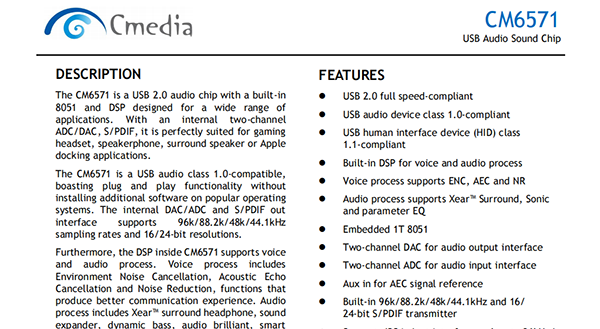The CM6571 is a USB 2.0 audio chip with a built-in 8051 and DSP for a wide range of applications. With an internal 2-channel ADC/DAC, S/PDIF, it is perfectly suited to gaming headset, speaker phone, surround speaker or apple docking applications.
