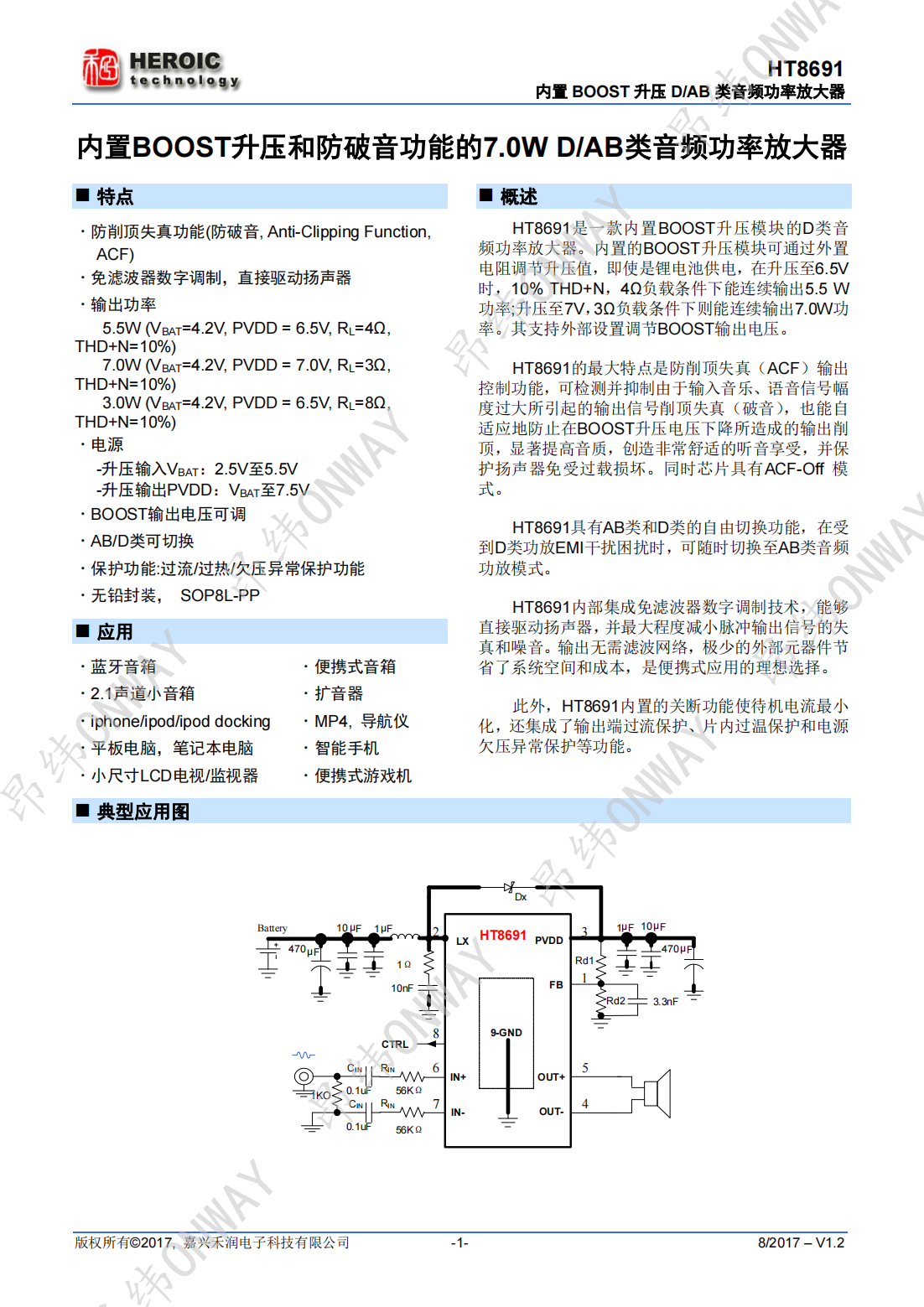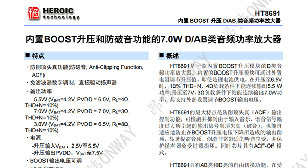 HT8691是一款內(nèi)置BOOST升壓模塊的D類音頻功率放大器。內(nèi)置的BOOST升壓模塊可通過(guò)外置電阻調(diào)節(jié)升壓值,即使是鋰電池供電,在升壓至6.5V時(shí),10%THD+N,4Ω負(fù)載條件下能連續(xù)輸出5.5 W功率;升壓至7V,3Ω負(fù)載條件下則能連續(xù)輸出7.0W功率。其支持外部設(shè)置調(diào)節(jié)BOOST輸出電壓。HT8691的最大特點(diǎn)是防削頂失真(ACF)輸出控制功能,可檢測(cè)并抑制由于輸入音樂(lè)、語(yǔ)音信號(hào)幅度過(guò)大所引起的輸出信號(hào)削頂失真(破音),也能自適應(yīng)地防止在BOOST升壓電壓下降所造成的輸出削頂,顯著提高音質(zhì),創(chuàng)造非常舒適的聽(tīng)音享受,并保護(hù)揚(yáng)聲器免受過(guò)載損壞。同時(shí)芯片具有ACF-Off模式。