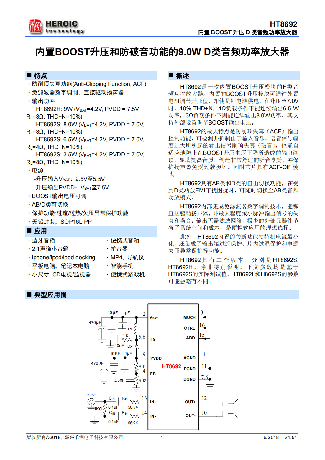 HT8692是一款內(nèi)置BOOST升壓模塊的F類音 頻功率放大器。內(nèi)置的BOOST升壓模塊可通過外置 電阻調(diào)節(jié)升壓值,即使是鋰電池供電,在升壓至7.0V 時,10% THD+N,4Ω負(fù)載條件下能連續(xù)輸出6.5 W 功率,3Ω負(fù)載條件下則能連續(xù)輸出8.0W功率。其支 持外部設(shè)置調(diào)節(jié)BOOST輸出電壓