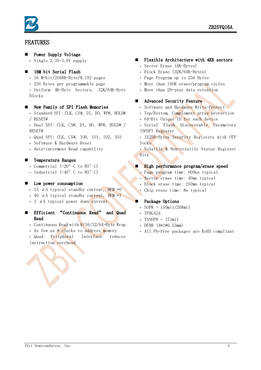 The ZB25VQ16A of non-volatile flash memory device supports the standard Serial Peripheral Interface (SPI)