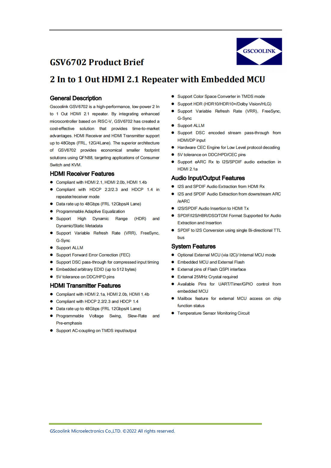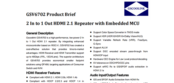 2 In to 1 Out HDMI 2.1 Repeater with Embedded MCU 產(chǎn)品詳情: ·Gscoolink GSV6702是一款高性能、低功耗的2-IN-1OUT的HDMI2.1中繼器。 ·HDMI接收器和HDMI發(fā)射器支持48Gbps(FRL,12G/4Lane)。 ·GSV6702采用更小巧的QFN88封裝。 ·產(chǎn)品應用:交換機和KVM。