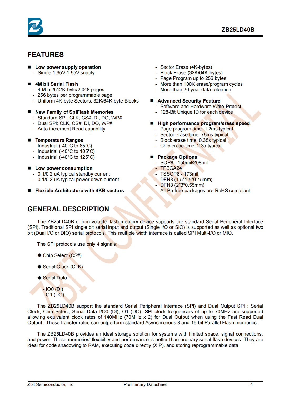 The ZB25LD40B of non-volatile flash memory device supports the standard Serial Peripheral Interface (SPI).