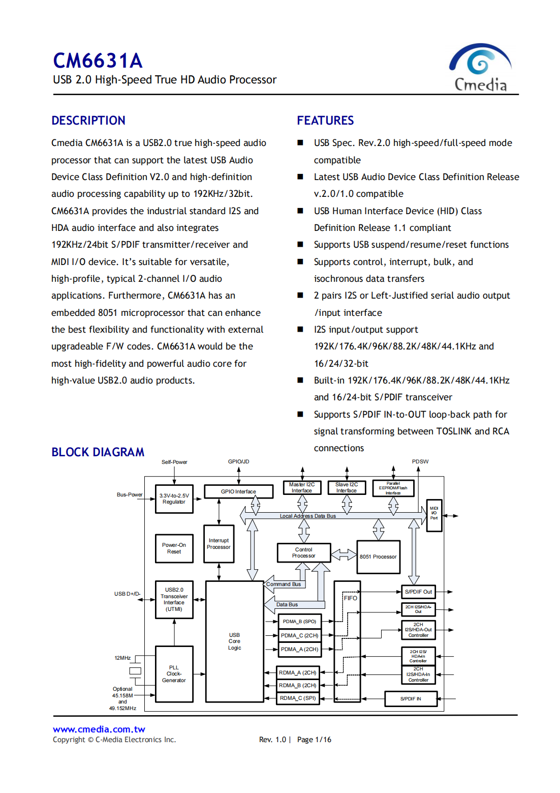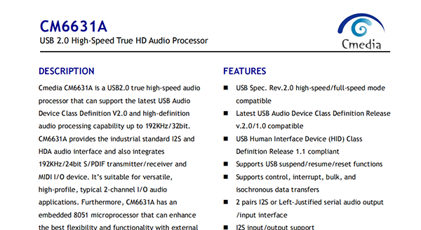 Cmedia CM6631A is a USB2.0 true high-speed audio processor that can support the latest USB Audio Device Class Definition V2.0 and high-definition audio processing capability up to 192KHz/32bit