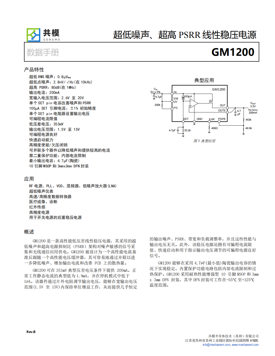 GM1200是一款高性能低壓差線性穩(wěn)壓電源,其采用的超低噪聲和超高電源抑制比(PSRR)架構(gòu)對噪聲敏感的信號采集和無線通信應(yīng)用供電。GM1200被設(shè)計(jì)為一個(gè)高性能電流基準(zhǔn)后跟隨一個(gè)高性能電壓緩沖器,其可容易地通過并聯(lián)以進(jìn)一步降低噪聲、增加輸出電流和改善PCB上的散熱量。