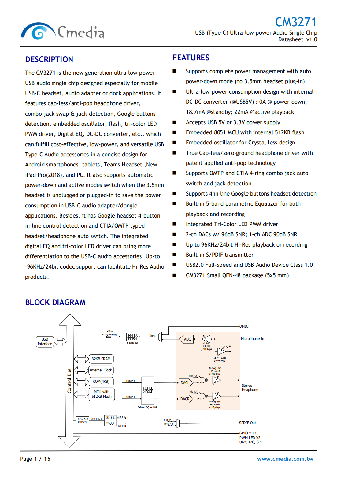The CM3271 is the new generation ultra-low-power USB audio single chip designed especially for mobile USB-C headset, audio adapter or dock applications