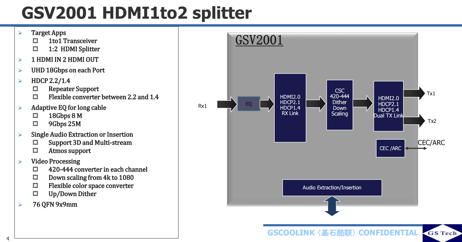 GSV2001高性價(jià)比HDMI2.0/HDCP2.2 1to2 Splitter,支持DownScaler,CSC及音頻分離和音頻嵌入,支持ARC及CEC功能。可以替代ITE CH6001/IT6663 EP9162S LT86012