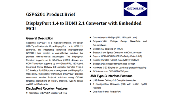 Gscoolink GSV6201 is a high-performance,low-power,USB Type-C Alternate Mode DisplayPort 1.4 to HDMI 2.1 converter.By integrating enhanced microcontroller,