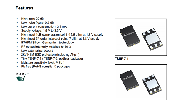 The BGA715N7 is a front-end low noise amplifier for Global Navigation Satellite Systems(GNSS)from 1550 MHz to 1615 MHz like GPS,Galileo,GLONASS,COMPASS and others.The LNA provides 20 dB gain,0.7 dB noise figure and high linearity performance in the application configuration described in Chapter 3.Current consumption is as low as 3.3 mA.The BGA715N7 is based upon Infineon Technologies‘B7HFM Silicon Germanium technology.It operates over a 1.5 V to 3.3 V supply range.If an ultra low noise figure of 0.6 dB is required,please refer to Infineon Application Note AN161.