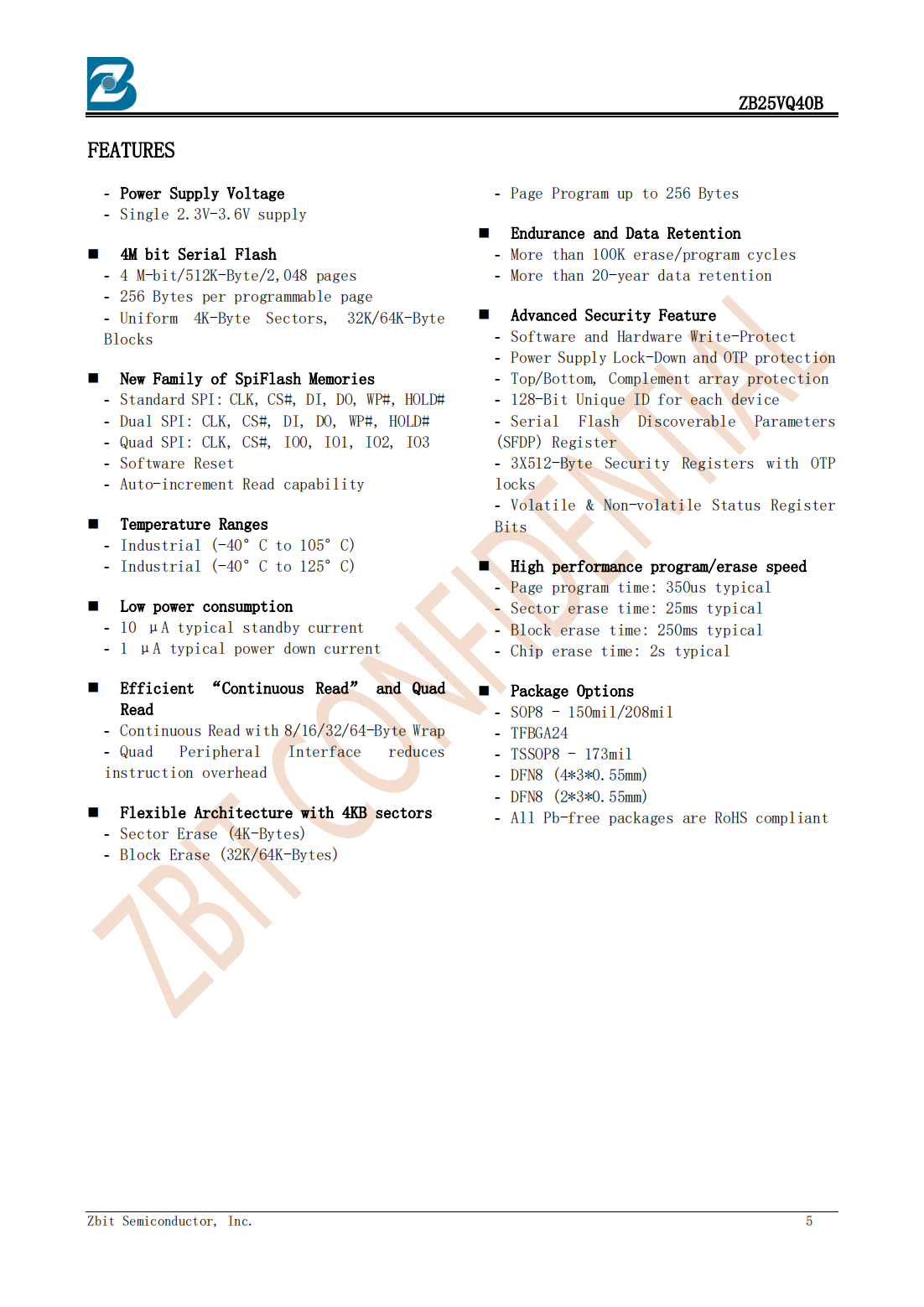 The ZB25VQ40B of non-volatile flash memory device supports the standard Serial Peripheral Interface(SPI).Traditional SPI single bit serial input and output(Single I/O or SIO)is supported as well as optional two bit(Dual I/O or DIO)and four bit(quad I/O)serial protocols.This multiple width interface is called SPI Multi-I/O or MIO.