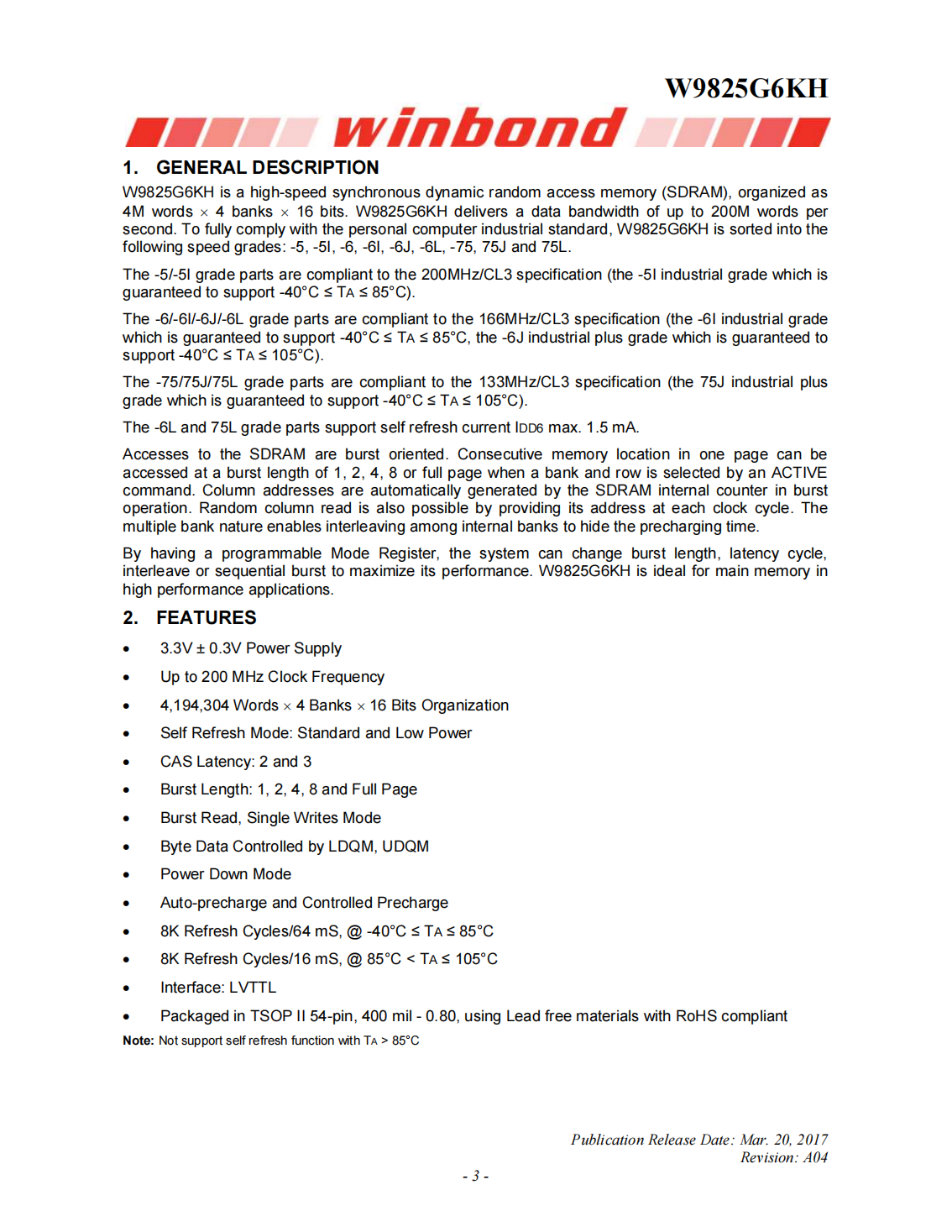 W9825G6KH is a high-speed synchronous dynamic random access memory(SDRAM),organized as 4M words?4 banks?16 bits.W9825G6KH delivers a data bandwidth of up to 200M words per second.To fully comply with the personal computer industrial standard,W9825G6KH is sorted into the following speed grades:-5,-5I,-6,-6I,-6J,-6L,-75,75J and 75L.