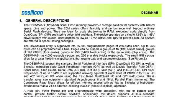 The DS25M4AB(128M-bit)Serial Flash memory provides a storage solution for systems with limited space,pins and power.The 25M series offers flexibility and performance well beyond ordinary Serial Flash devices.They are ideal for code shadowing to RAM,executing code directly from Dual/Quad SPI(XIP)and storing voice,text and data.The device operates on a single 1.65V to 1.95V power supply with current consumption as low as 13mA active and 1μA for power-down.All devices are offered in space-saving packages.