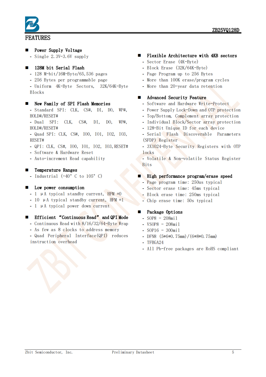 The ZB25VQ128D of non-volatile flash memory device supports the standard Serial Peripheral Interface(SPI).Traditional SPI single bit serial input and output(Single I/O or SIO)is supported as well as optional two bit(Dual I/O or DIO)and four bit(quad I/O or QIO)serial protocols.This multiple width interface is called SPI Multi-I/O or MIO.