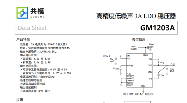 GM1203A集低噪聲、高PSRR和高輸出電流能力等特性于一體,非常適合為高速通信、視頻、醫(yī)療或測試和測量應用等噪聲敏感型組件供電。GM1203A高性能的輸出品質,可抑制電源產生的相位噪聲和時鐘抖動,因此它非常適合為高性能串行器和解串器(SerDes)、模數轉換器(ADC)、數模轉換器(DAC)和射頻組件供電。該器件具備快速負載瞬態(tài)響應的性能和大于5V的輸出能力,尤其適合射頻放大器使用。