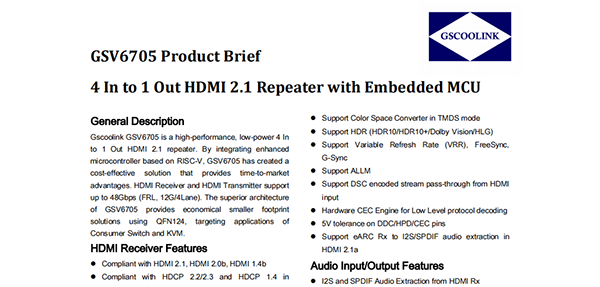 Gscoolink GSV6705 is a high-performance,low-power 4 In to 1 Out HDMI 2.1 repeater.By integrating enhanced microcontroller based on RISC-V,GSV6705 has created a cost-effective solution that provides time-to-market advantages.HDMI Receiver and HDMI Transmitter support up to 48Gbps(FRL,12G/4Lane).The superior architecture of GSV6705 provides economical smaller footprint solutions using QFN124,targeting applications of Consumer Switch and KVM.