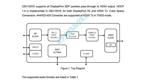 The superior architecture of GSV1201E provides economical smaller footprint solutionsusing QFN64,targeting application of Type-C Hub.GSV1201E supports all DisplayPort SDP packets pass-through to HDMI output.HDCP 1.4 is implemented in GSV1201E for both DisplayPort Rx and HDMI Tx.Color Space Conversion,444/422-420 Converter are supported at HDMI Tx in TMDS mode