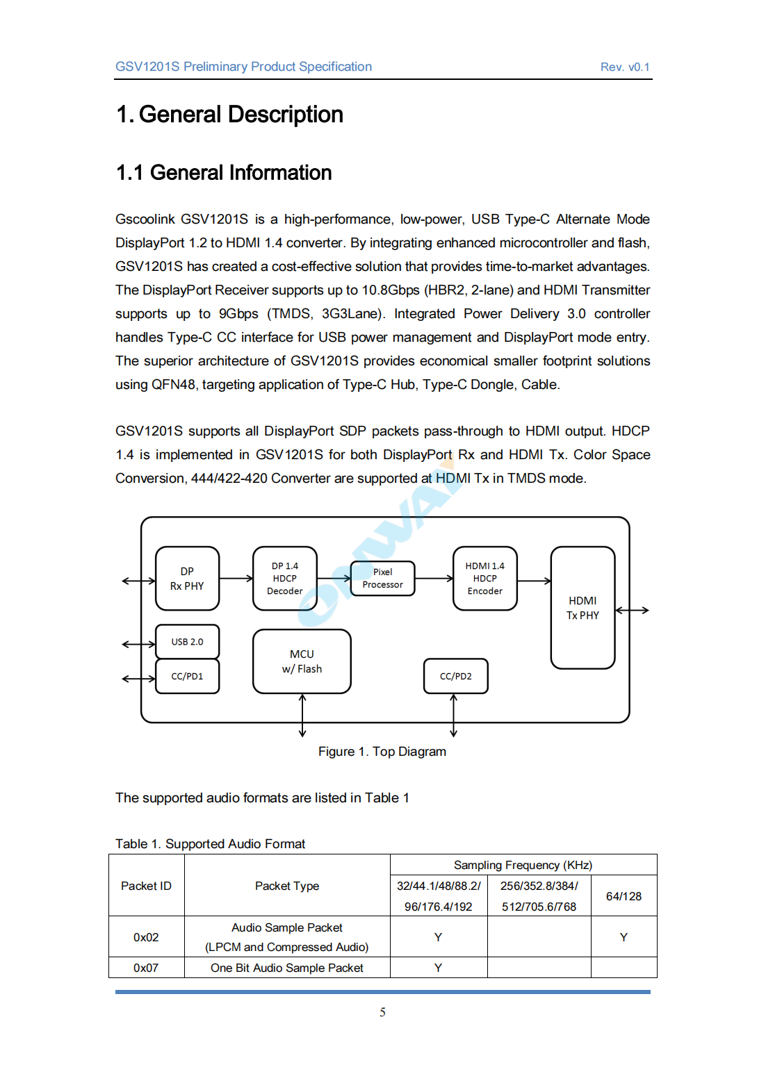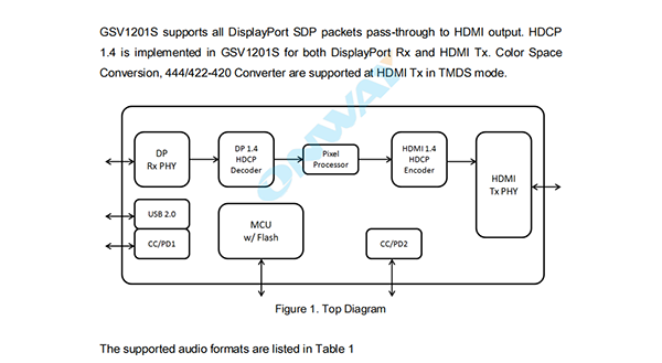 The superior architecture of GSV1201S provides economical smaller footprint solutionsusing QFN48,targeting application of Type-C Hub,Type-C Dongle,Cable.GSV1201S supports all DisplayPort SDP packets pass-through to HDMI output.HDCP 1.4 is implemented in GSV1201S for both DisplayPort Rx and HDMI Tx.Color Space Conversion,444/422-420 Converter are supported at HDMI Tx in TMDS mode.
