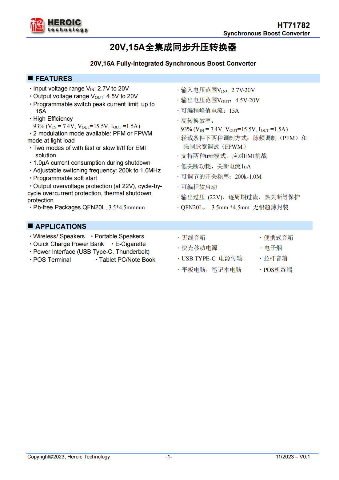 HT71782具有2.7V至20V寬輸入電壓范圍,可為采用單節(jié)或兩節(jié)鋰電池的應用提供支持。該器件具備15A開關電流能力,并且能夠提供20V的輸出電壓。
