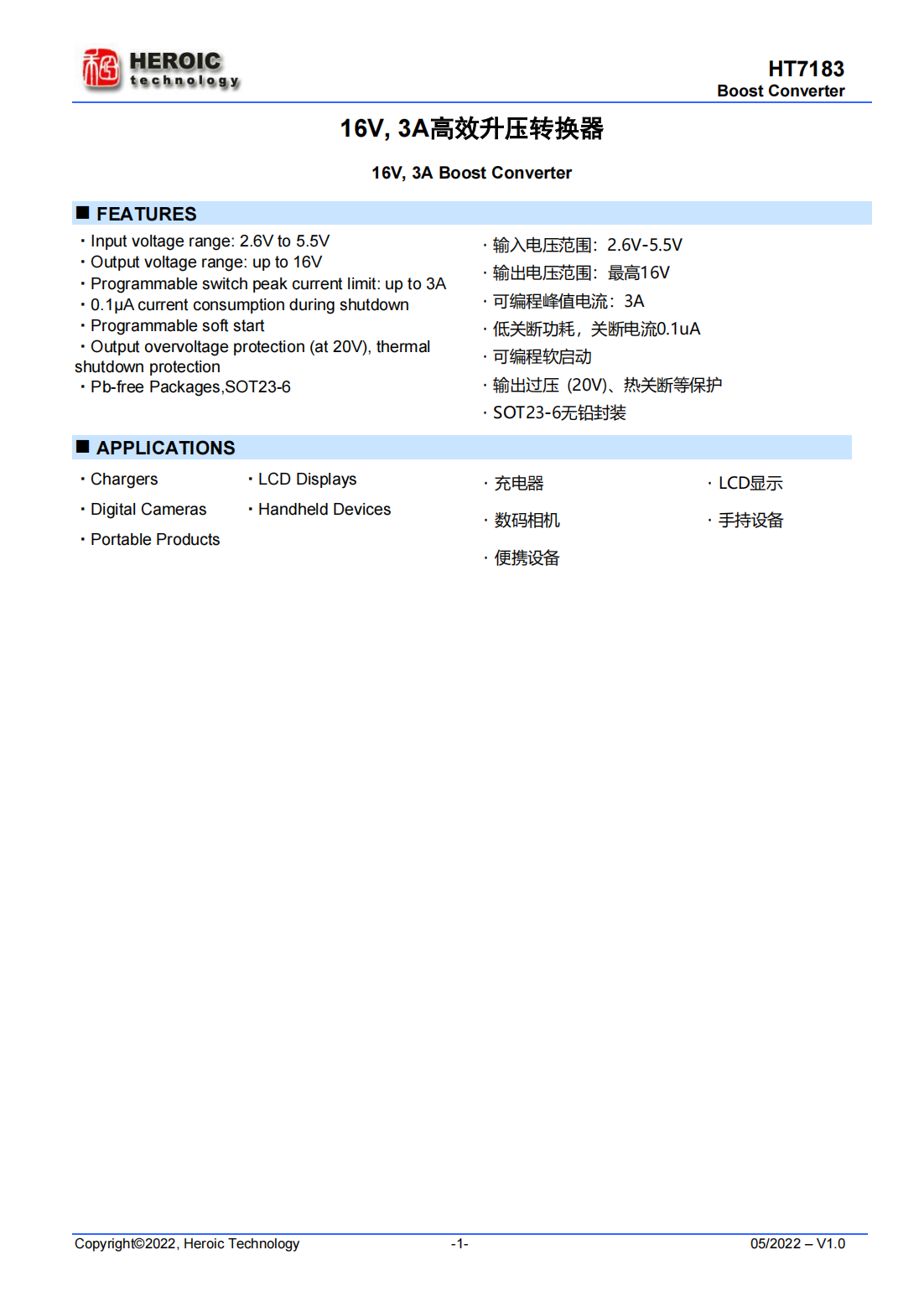 HT7183具有2.6V至5.5V輸入電壓范圍,可為各類不同供電的應(yīng)用提供支持。該器件具備3A開關(guān)電流能力,并且能夠提供高達16V的輸出電壓。