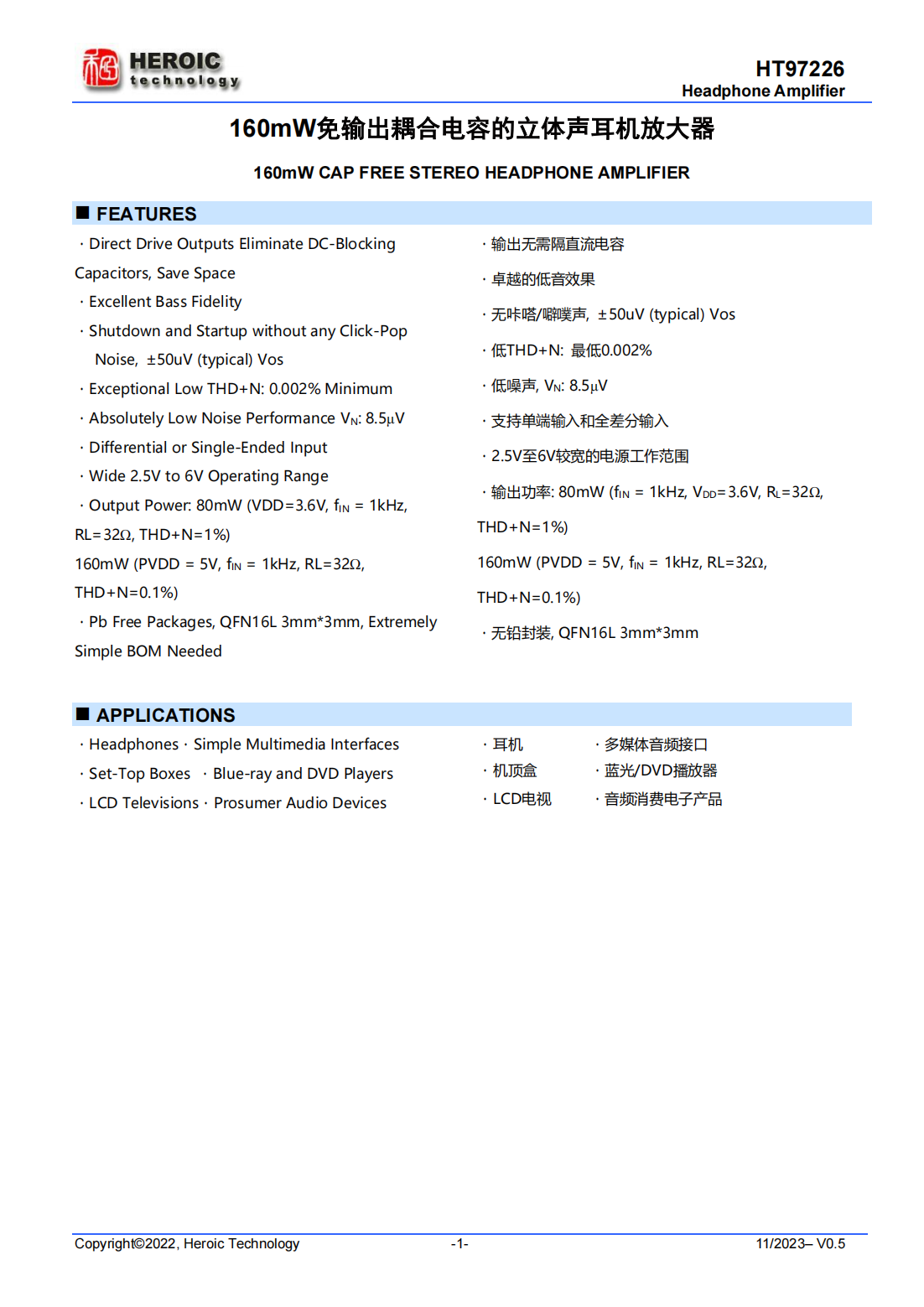 HT97226是一款差分輸入/單端輸入、可直接輸出驅(qū)動(dòng)的耳機(jī)放大器。5V供電時(shí),器件可為32ohm耳機(jī)提供180mW的功率。器件可通過(guò)外部電阻調(diào)節(jié)增益。器件在音頻范圍內(nèi)具有卓越的THD+N表現(xiàn)。