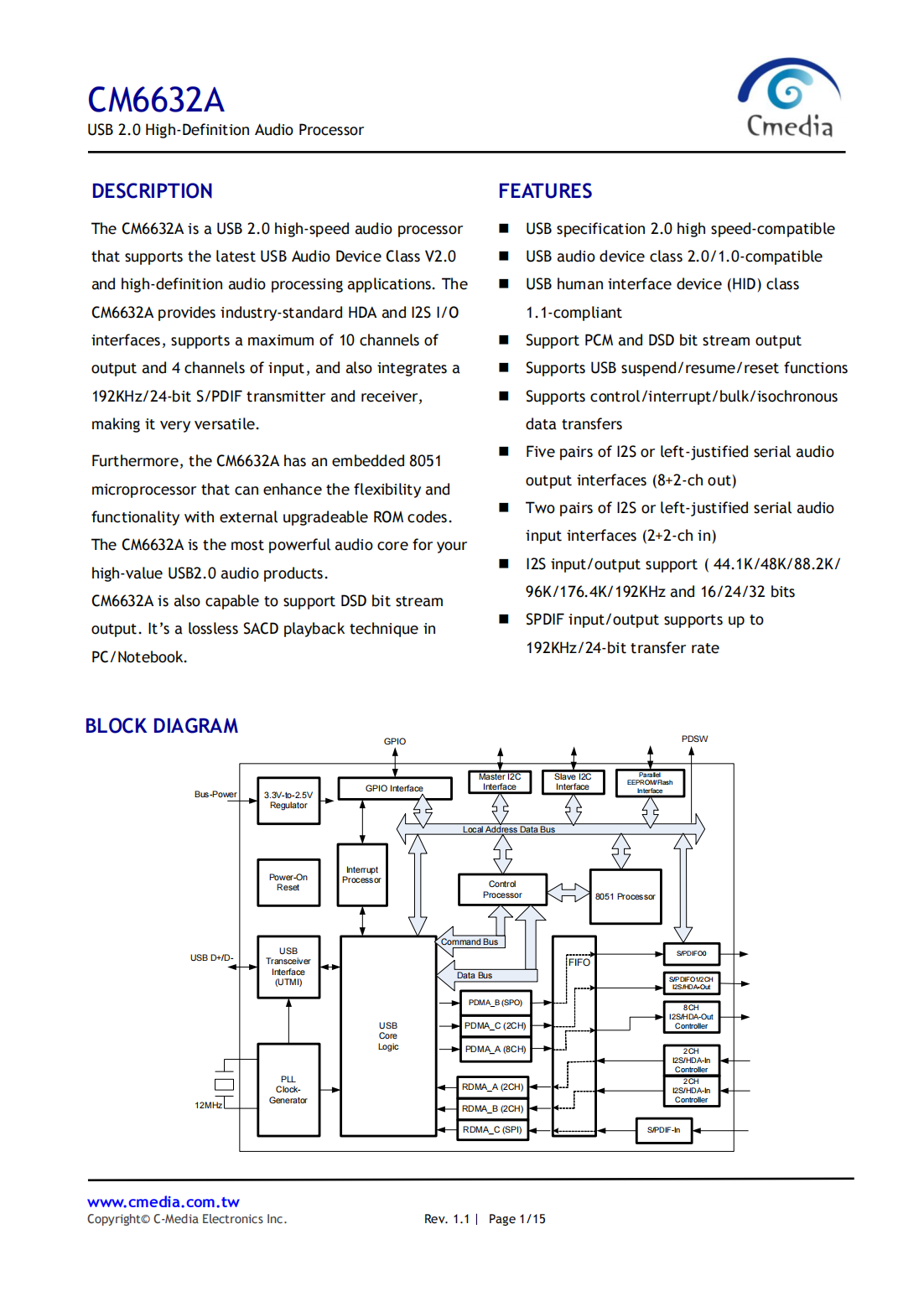 The CM6632A is a USB 2.0 high-speed audio processor that supports the latest USB Audio Device Class V2.0 and high-definition audio processing applications.The CM6632A provides industry-standard HDA and I2S I/O interfaces,supports a maximum of 10 channels of output and 4 channels of input,and also integrates a 192KHz/24-bit S/PDIF transmitter and receiver,making it very versatile.Furthermore,the CM6632A has an embedded 8051 microprocessor that can enhance the flexibility and functionality with external upgradeable ROM codes.