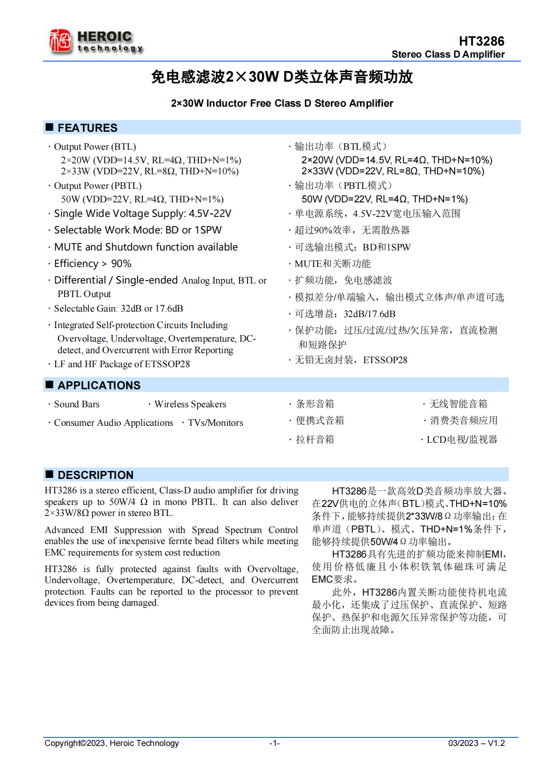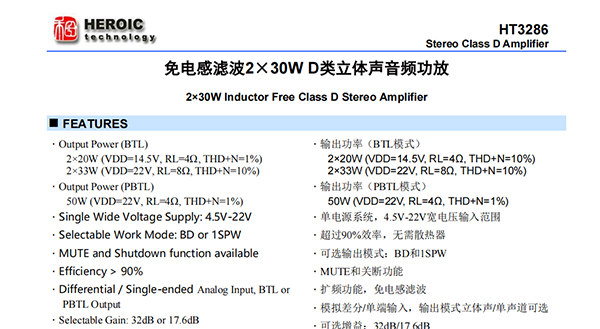 HT3286是一款高效D類音頻功率放大器。在22V供電的立體聲(BTL)模式、THD+N=10%條件下,能夠持續(xù)提供2*33W/8Ω功率輸出;在單聲道(PBTL)、模式、THD+N=1%條件下,能夠持續(xù)提供50W/4Ω功率輸出。HT3286具有先進(jìn)的擴頻功能來抑制EMI,使用價格低廉且小體積鐵氧體磁珠可滿足EMC要求。此外,HT3286內(nèi)置關(guān)斷功能使待機電流最小化,還集成了過壓保護(hù)、直流保護(hù)、短路保護(hù)、熱保護(hù)和電源欠壓異常保護(hù)等功能,可全面防止出現(xiàn)故障。