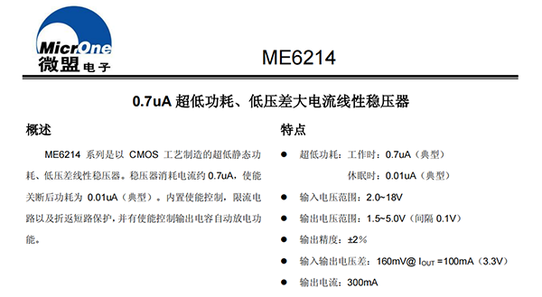 ME6214系列是以CMOS工藝制造的超低靜態(tài)功耗、低壓差線性穩(wěn)壓器。穩(wěn)壓器消耗電流約0.7uA,使能關斷后功耗為0.01uA(典型)。內(nèi)置使能控制,限流電路以及折返短路保護,并有使能控制輸出電容自動放電功能。