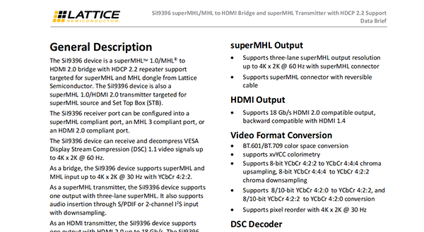 The SiI9396 device is a superMHLTM 1.0/MHL®to HDMI 2.0 bridge with HDCP 2.2 repeater support targeted for superMHL and MHL dongle from Lattice Semiconductor.The SiI9396 device is also a superMHL 1.0/HDMI 2.0 transmitter targeted for superMHL source and Set Top Box(STB).