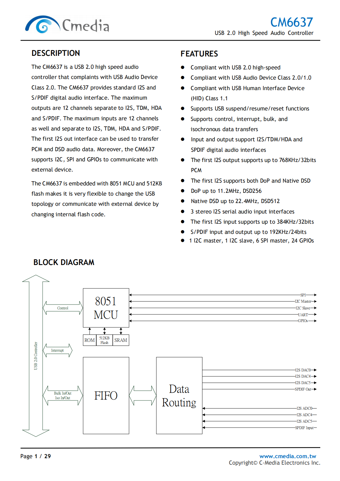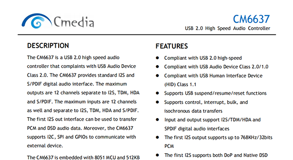 The CM6637 is a USB 2.0 high speed audio controller that complaints with USB Audio Device Class 2.0