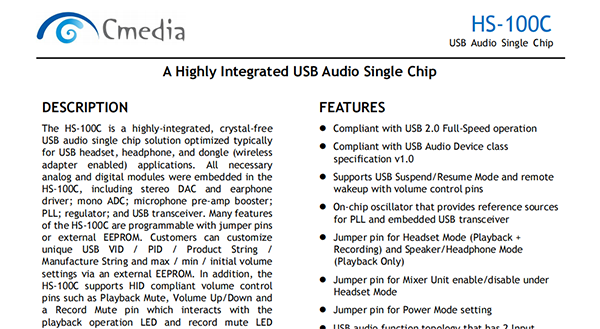 HS-100C是一款高度集成、無晶振的USB音頻單芯片解決方案,通常針對USB耳機、耳機和加密狗(支持無線適配器)應用進行優(yōu)化。HS-100C中嵌入了所有必要的模擬和數(shù)字模塊,包括立體聲DAC和耳機驅(qū)動器;單聲道ADC;麥克風前置放大器;PLL;監(jiān)管者和USB收發(fā)器。HS-100C的許多功能可通過跳線引腳或外部EEPROM進行編程。