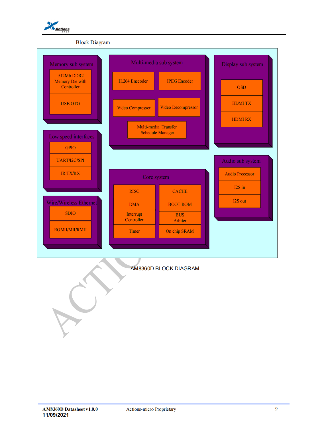 The AM8360D processor from Actions-Micro is a highly integrated mix signal SoC target at multi-media applications.The AM8360D emmedded CPU is a high performance,low power 32bit RISC core with DSP instruction extension,which can run as fast as 700MHz.