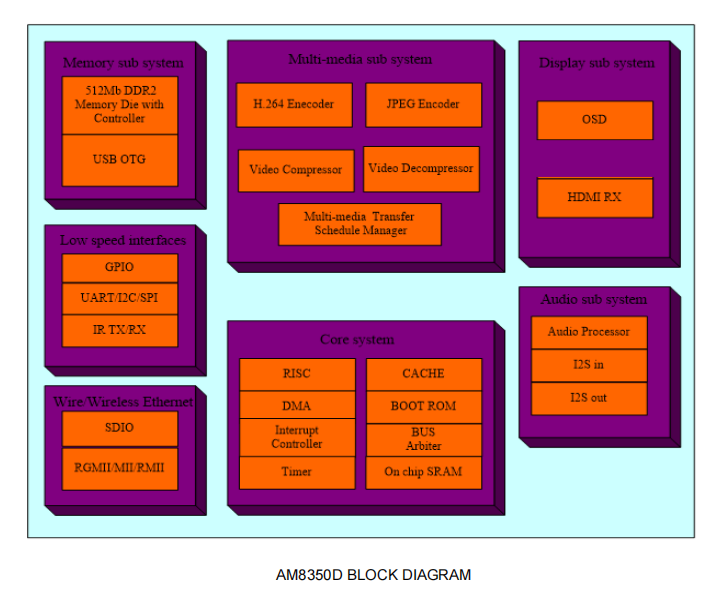 AM8350D還集成了1個USB OTG控制器、UART、I2C、SPI等。內(nèi)置512Mb DDR2內(nèi)存芯片