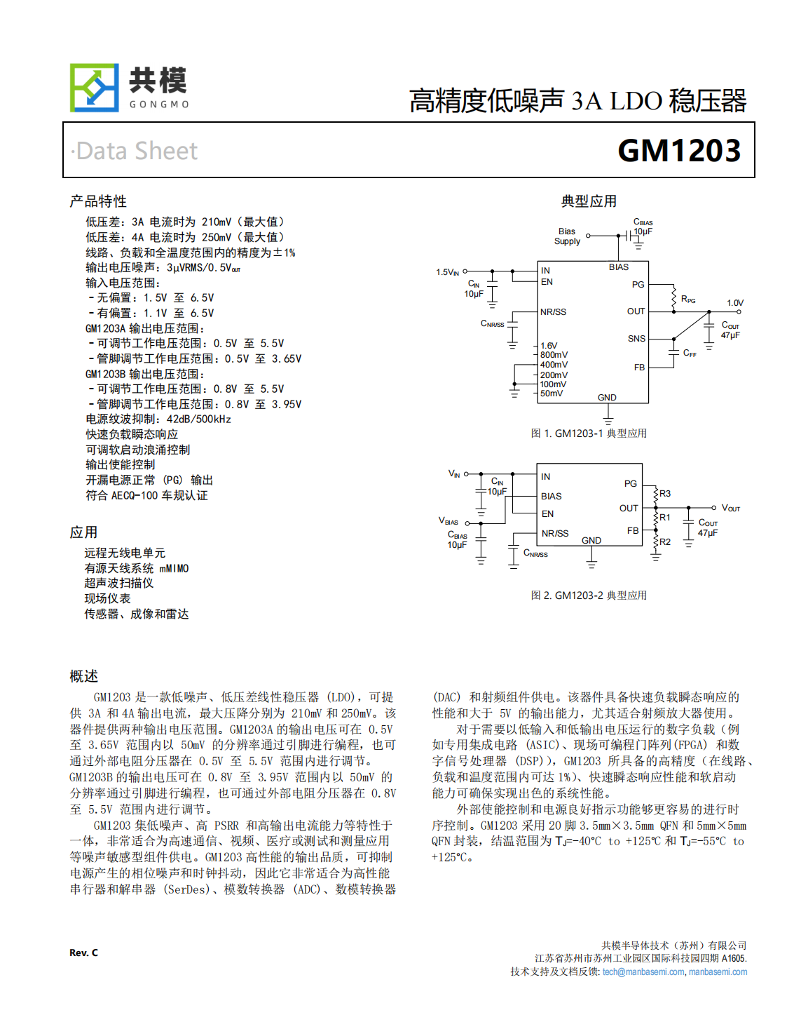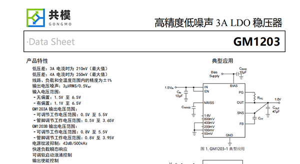 GM1203集低噪聲、高PSRR和高輸出電流能力等特性于一體,非常適合為高速通信、視頻、醫(yī)療或測試和測量應(yīng)用等噪聲敏感型組件供電。GM1203高性能的輸出品質(zhì),可抑電源產(chǎn)生的相位噪聲和時(shí)鐘抖動,因此它非常適合為高性能串行器和解串器(SerDes)、模數(shù)轉(zhuǎn)換器(ADC)、數(shù)模轉(zhuǎn)換器(DAC)和射頻組件供電。該器件具備快速負(fù)載瞬態(tài)響應(yīng)的性能和大于5V的輸出能力,尤其適合射頻放大器使用。對于需要以低輸入和低輸出電壓運(yùn)行的數(shù)字負(fù)載(例如專用集成電路(ASIC)、現(xiàn)場可編程門陣列(FPGA)和數(shù)字信號處理器(DSP)),GM1203所具備的高精度(在線路、負(fù)載和溫度范圍內(nèi)可達(dá)1%)、快速瞬態(tài)響應(yīng)性能和軟啟動能力可確保實(shí)現(xiàn)出色的系統(tǒng)性能。外部使能控制和電源良好指示功能夠更容易的進(jìn)行時(shí)序控制。GM1203采用20腳3.5mm×3.5mm QFN和5mm×5mm QFN封裝,結(jié)溫范圍為TJ=-40°C to+125°C和TJ=-55°C to+125°C。