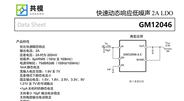 GM12046是一款低壓差穩(wěn)壓器,專為快速瞬態(tài)響應而優(yōu)化。該裝置能夠提供2A的輸出電流,典型壓降為220mV。工作靜態(tài)電流為1mA,關機時降至1μA以下,同時壓差模式下靜態(tài)電流控制良好。除了快速瞬態(tài)響應外,GM12046還具有9.8μVRMS的低輸出電壓噪聲和高達75dB的電源紋波抑制比,這使得該器件非常適合敏感的射頻電源和醫(yī)療影像應用。輸出電壓范圍為1.21V至7V。