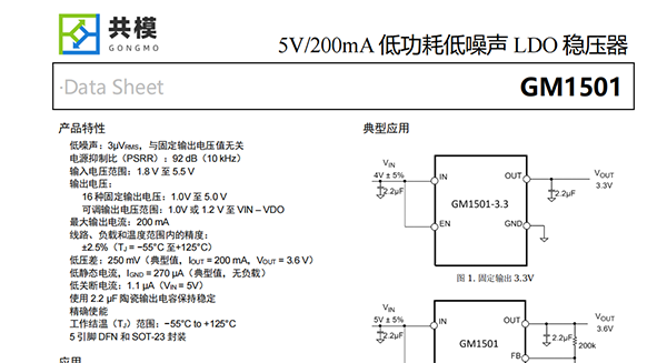 GM1501提供6種固定輸出電壓選項(xiàng)?,F(xiàn)有庫(kù)存提供下列電壓版本:1.0V(可調(diào)節(jié))或1.2V(可調(diào)節(jié))、1.5V、1.8V、2.5V、3.0V、3.3V、3.6V和 5.0V等。每個(gè)固定輸出電壓都可以通過(guò)外部反饋分壓器在初始設(shè)定點(diǎn)以上調(diào)整。這使 GM1501 可提供 1V 或 1.2V 至 VIN ? VDO的輸出電壓且具有高 PSRR 和低噪聲。GM1501提供5引腳DFN和SOT-23 封裝。