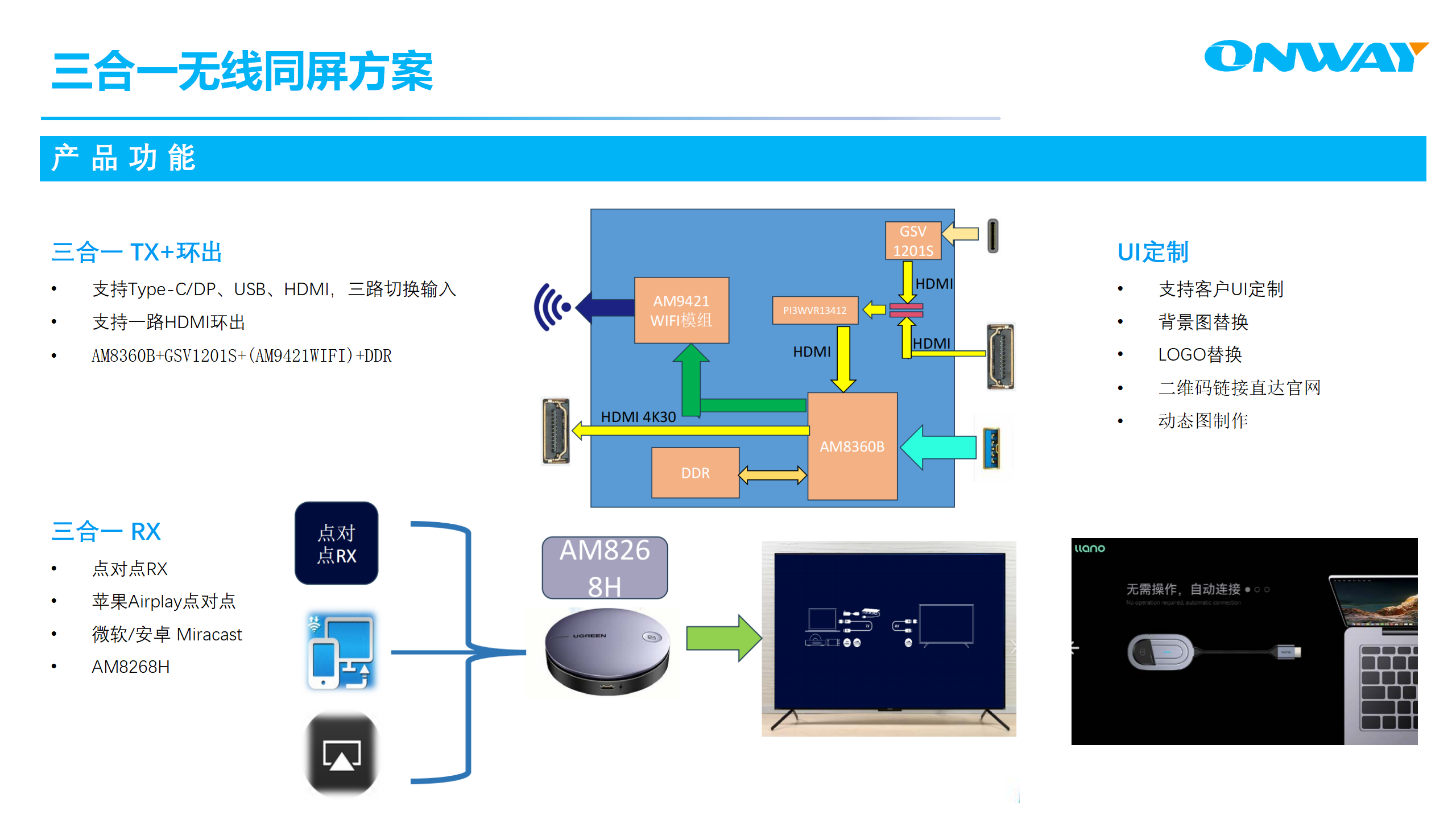 AM8268H是炬力北方微電子推出的一款無線視頻三合一芯,AM8268H既可以做為無線視頻點(diǎn)對(duì)點(diǎn)的RX使用,也可以單獨(dú)連接手機(jī)的自有協(xié)議,蘋果手機(jī)的Airpaly和安卓手機(jī)的Miracast,使得低端手機(jī)(2000元以下手機(jī))或者老款手機(jī)(iPhone14以前的手機(jī))在不支持Type-C/DP視頻輸出的時(shí)候,也可以通過無線視頻投屏到電視上而且AM8268H支持雙頻5.8G+2.4G,信號(hào)更穩(wěn)定。