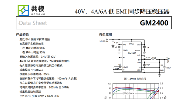 GM2400降壓穩(wěn)壓器采用低EMI架構(gòu),專為最大限度地降低EMI/EMC輻射并在高達3MHz的頻率下提供高效率而設(shè)計。其單片式結(jié)構(gòu)采用3mm x 4mm QFN封裝進行組裝,集成了電源開關(guān)和所有必要的電路,因而造就了一款PCB面積極小的解決方案。4μA的超低靜態(tài)電流(當(dāng)輸出處于全面調(diào)節(jié)狀態(tài)時)可實現(xiàn)那些要求在非常小負(fù)載電流條件下獲得極高效率的應(yīng)用。在任何負(fù)載下(從零電流至滿電流)皆可保持出色的瞬態(tài)響應(yīng),而且輸出電壓紋波低于10mVP-P。