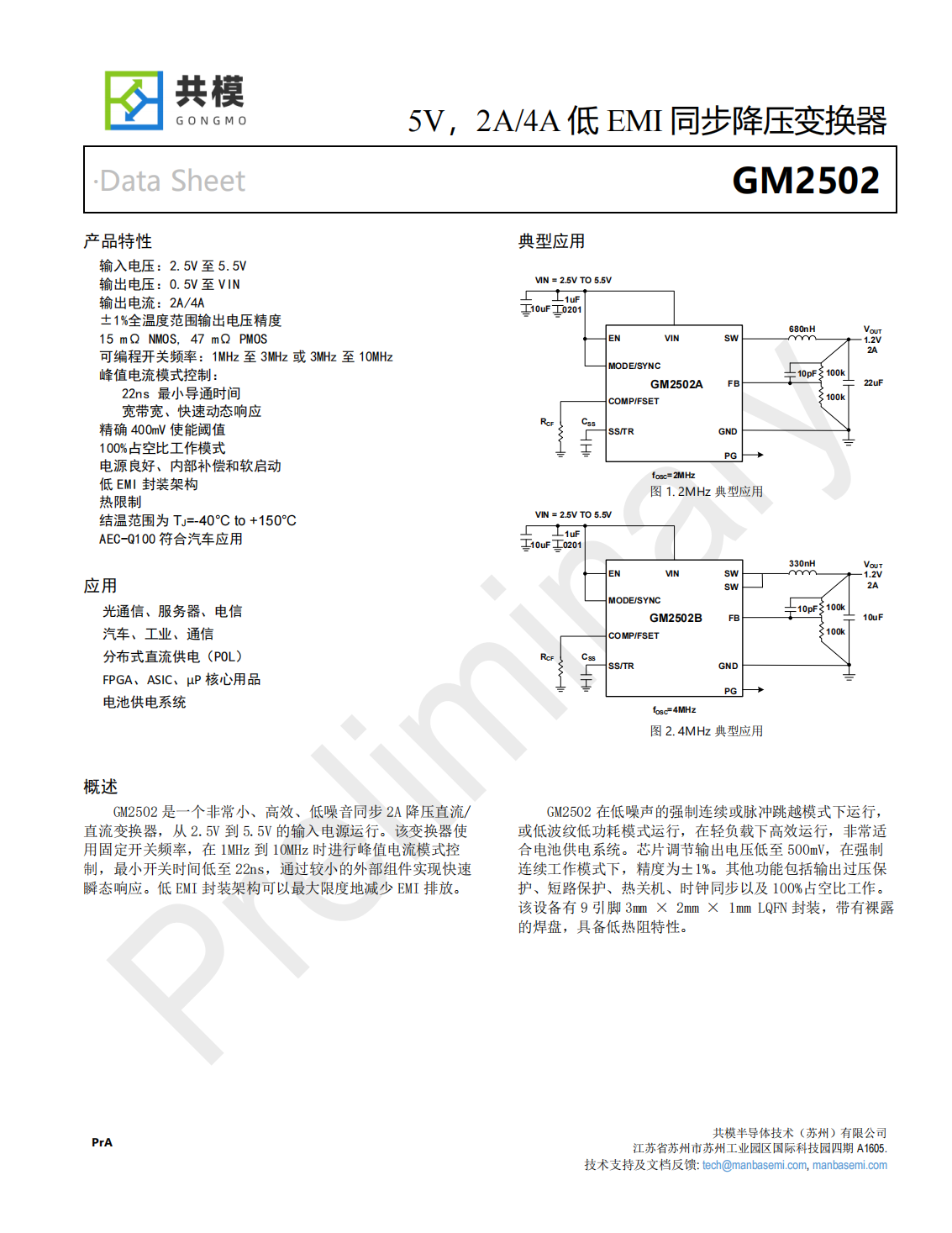 GM2502是一個非常小、高效、低噪音同步2A降壓直流/直流變換器,從2.5V到5.5V的輸入電源運行。該變換器使用固定開關頻率,在1MHz到10MHz時進行峰值電流模式控制,最小開關時間低至22ns,通過較小的外部組件實現(xiàn)快速瞬態(tài)響應。低EMI封裝架構(gòu)可以最大限度地減少EMI排放。