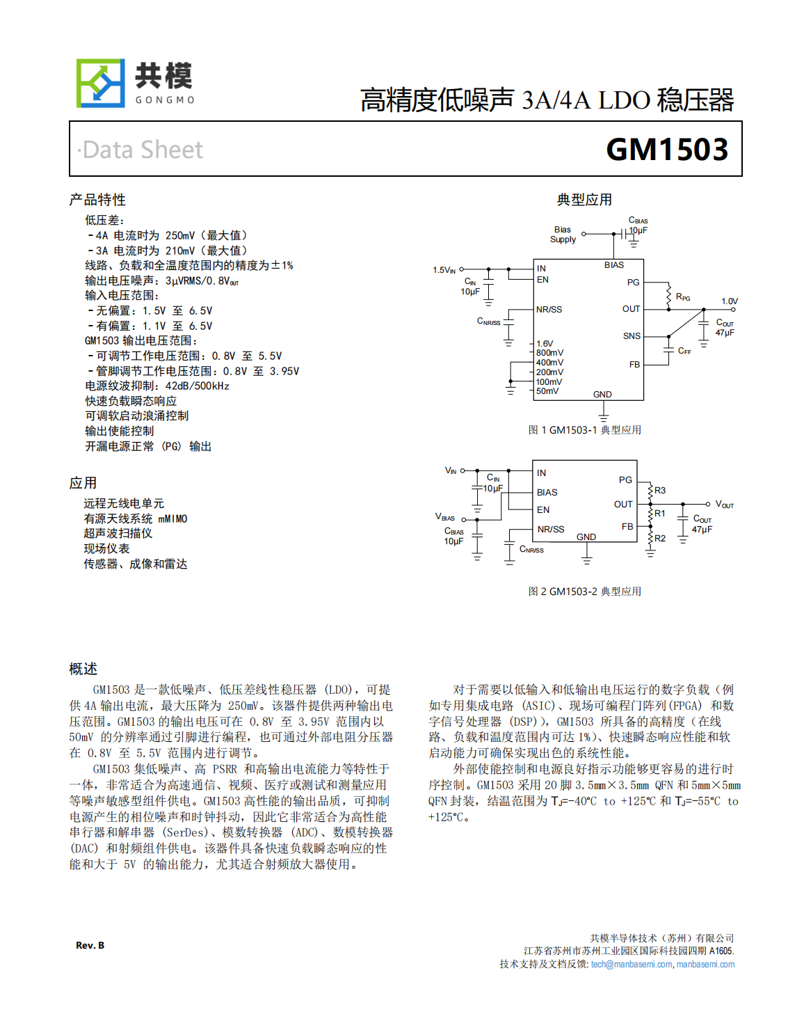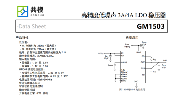 GM1503集低噪聲、高PSRR和高輸出電流能力等特性于一體,非常適合為高速通信、視頻、醫(yī)療或測(cè)試和測(cè)量應(yīng)用等噪聲敏感型組件供電。GM1503高性能的輸出品質(zhì),可抑制電源產(chǎn)生的相位噪聲和時(shí)鐘抖動(dòng),因此它非常適合為高性能串行器和解串器(SerDes)、模數(shù)轉(zhuǎn)換器(ADC)、數(shù)模轉(zhuǎn)換器(DAC)和射頻組件供電。該器件具備快速負(fù)載瞬態(tài)響應(yīng)的性能和大于5V的輸出能力,尤其適合射頻放大器使用。對(duì)于需要以低輸入和低輸出電壓運(yùn)行的數(shù)字負(fù)載(例如專用集成電路(ASIC)、現(xiàn)場(chǎng)可編程門陣列(FPGA)和數(shù)字信號(hào)處理器(DSP)),GM1503所具備的高精度(在線路、負(fù)載和溫度范圍內(nèi)可達(dá)1%)、快速瞬態(tài)響應(yīng)性能和軟啟動(dòng)能力可確保實(shí)現(xiàn)出色的系統(tǒng)性能。外部使能控制和電源良好指示功能夠更容易的進(jìn)行時(shí)序控制。GM1503采用20腳3.5mm×3.5mm QFN和5mm×5mm QFN封裝,結(jié)溫范圍為TJ=-40°C to+125°C和TJ=-55°C to+125°C。