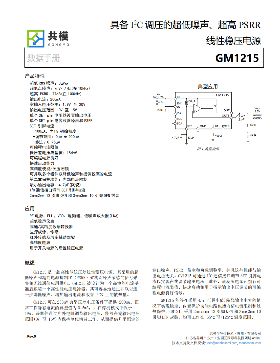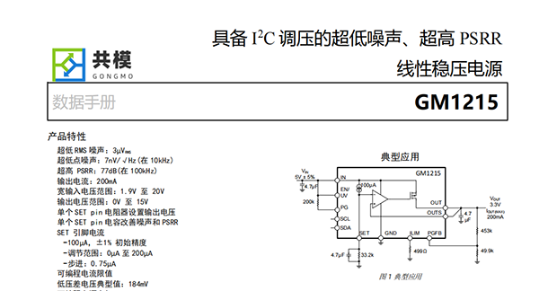 GM1215可在233mV典型壓差電壓條件下提供200mA。正常工作靜態(tài)電流的典型值為0.5mA,并在停機(jī)模式中低于1μA。該器件通過片外電阻調(diào)節(jié)輸出電壓,能夠在寬輸出電壓范圍(0V至15V)內(nèi)保持單位增益工作,從而提供幾乎恒定的輸出噪聲、PSRR、帶寬和負(fù)載調(diào)整率,并且這些性能與輸出電壓無關(guān)。GM1215可通過I2C通信接口調(diào)節(jié)SET引腳電流以實(shí)現(xiàn)在線調(diào)節(jié)輸出電壓。此外,該穩(wěn)壓電源還擁有可編程電流限值、快速啟動(dòng)和用于指示輸出電壓調(diào)節(jié)的可編程電源良好信號(hào)。
