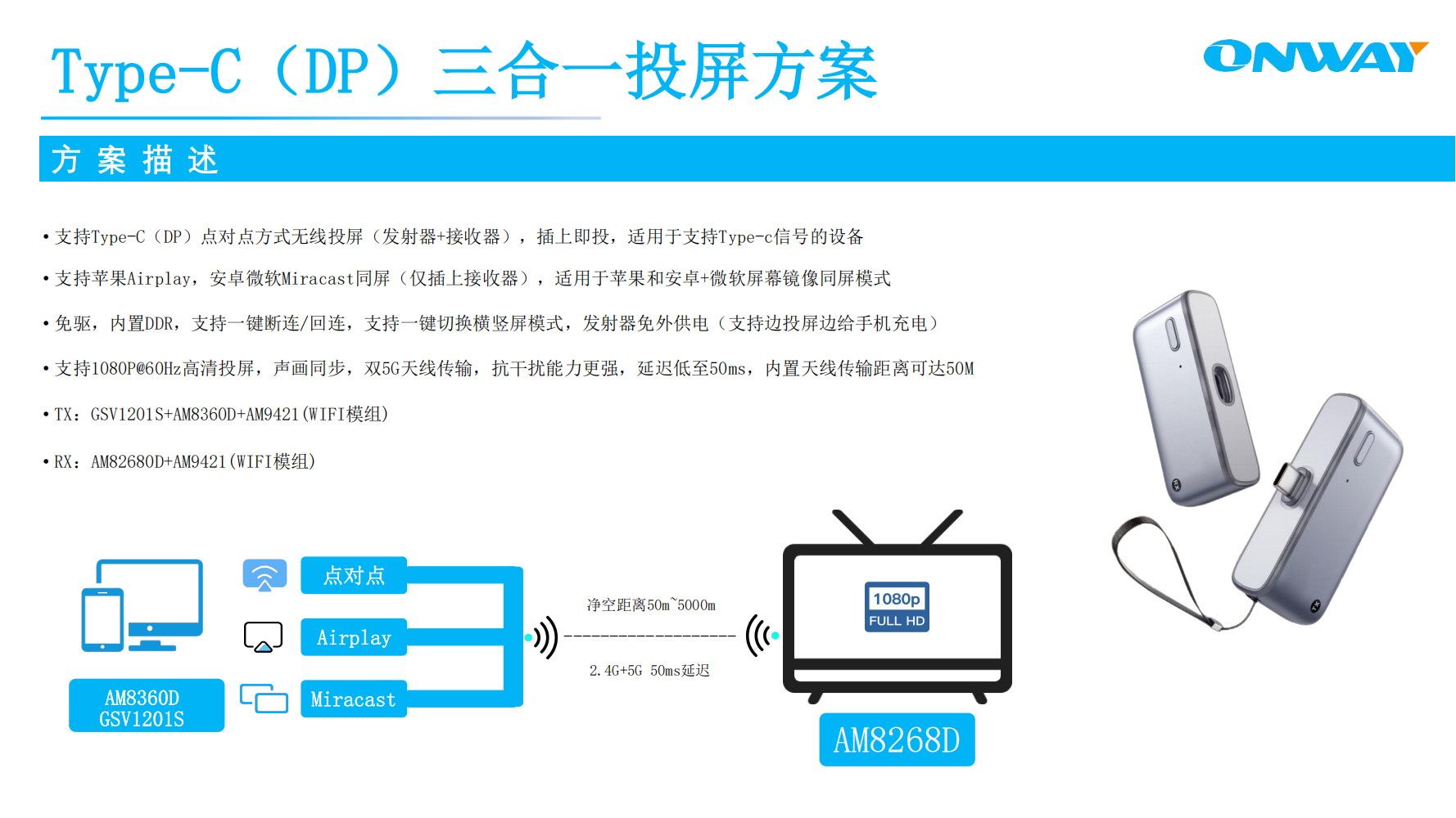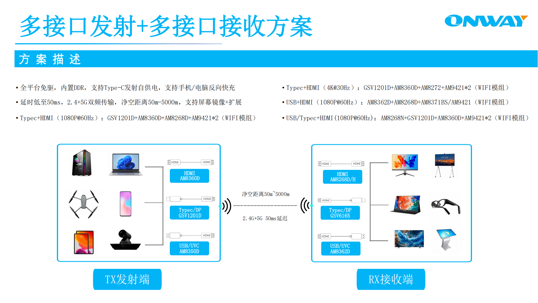 延遲40-60ms,凈空距離50m,2.4+5G傳輸